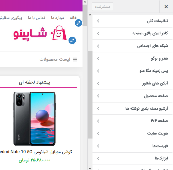 تنظیمات قالب شاپینو بسیار ساده و آسان بوده و قابلیت پیشنمایش زنده در آن وجود دارد.